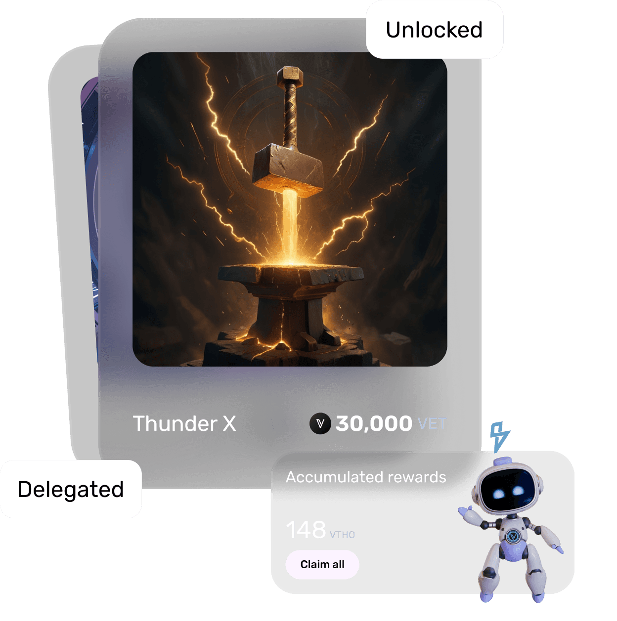 stake VET and delegateStake the required VET to mint an NFT linked to your chosen node tier, each with its own rewards, maturity period, and delegation power.